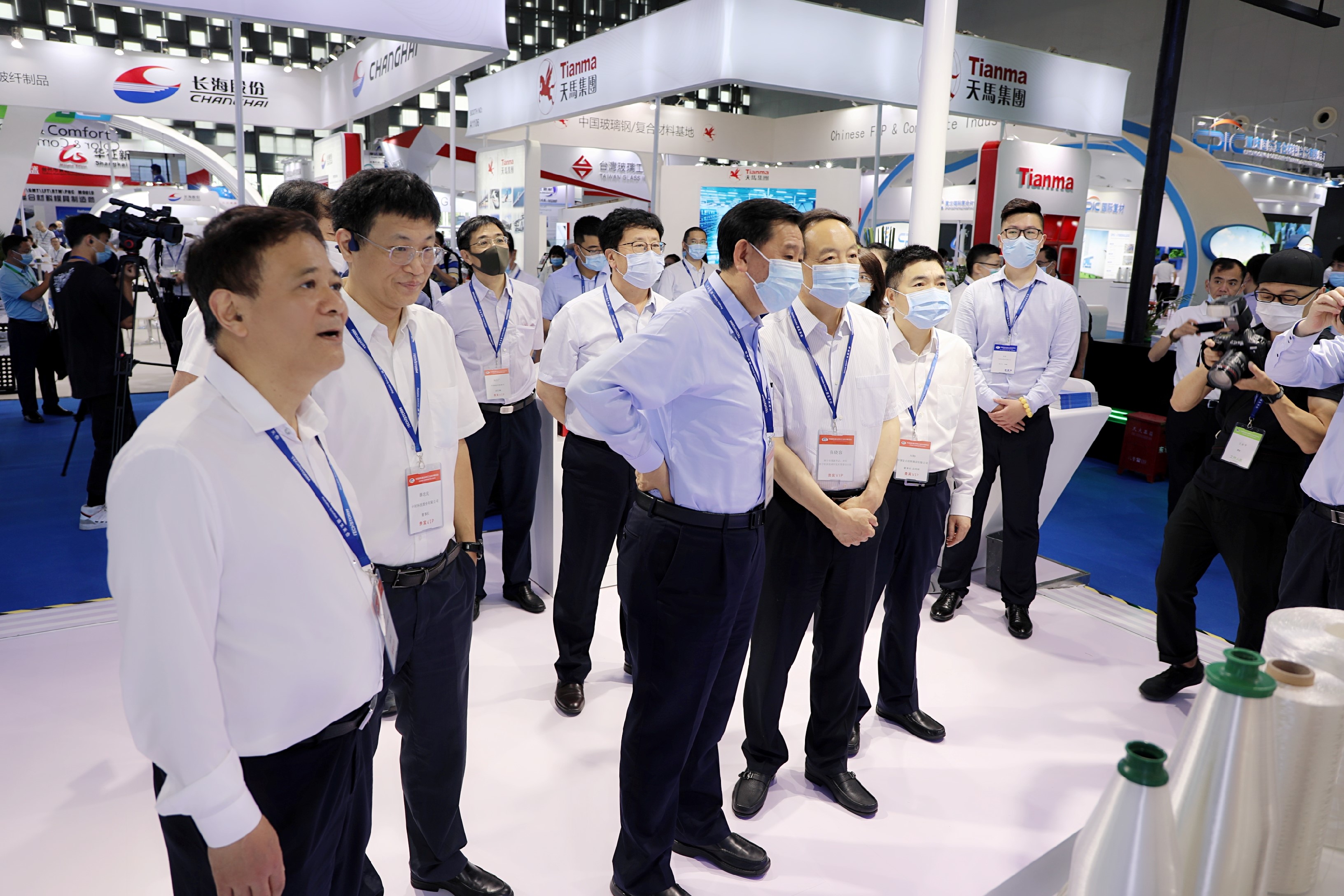 展會開幕后,中國建材集團(tuán)副董事長李新華,西寧市委副書記、市長、西寧經(jīng)濟(jì)技術(shù)開發(fā)區(qū)管委會主任張曉容到我公司參觀展臺、聽取匯報并慰問現(xiàn)場工作人員,中國復(fù)合材料集團(tuán)有限公司黨委書記、董事長兼總經(jīng)理劉標(biāo),公司薛忠民、宋伯廬、趙謙、趙俊山等領(lǐng)導(dǎo)陪同參觀。