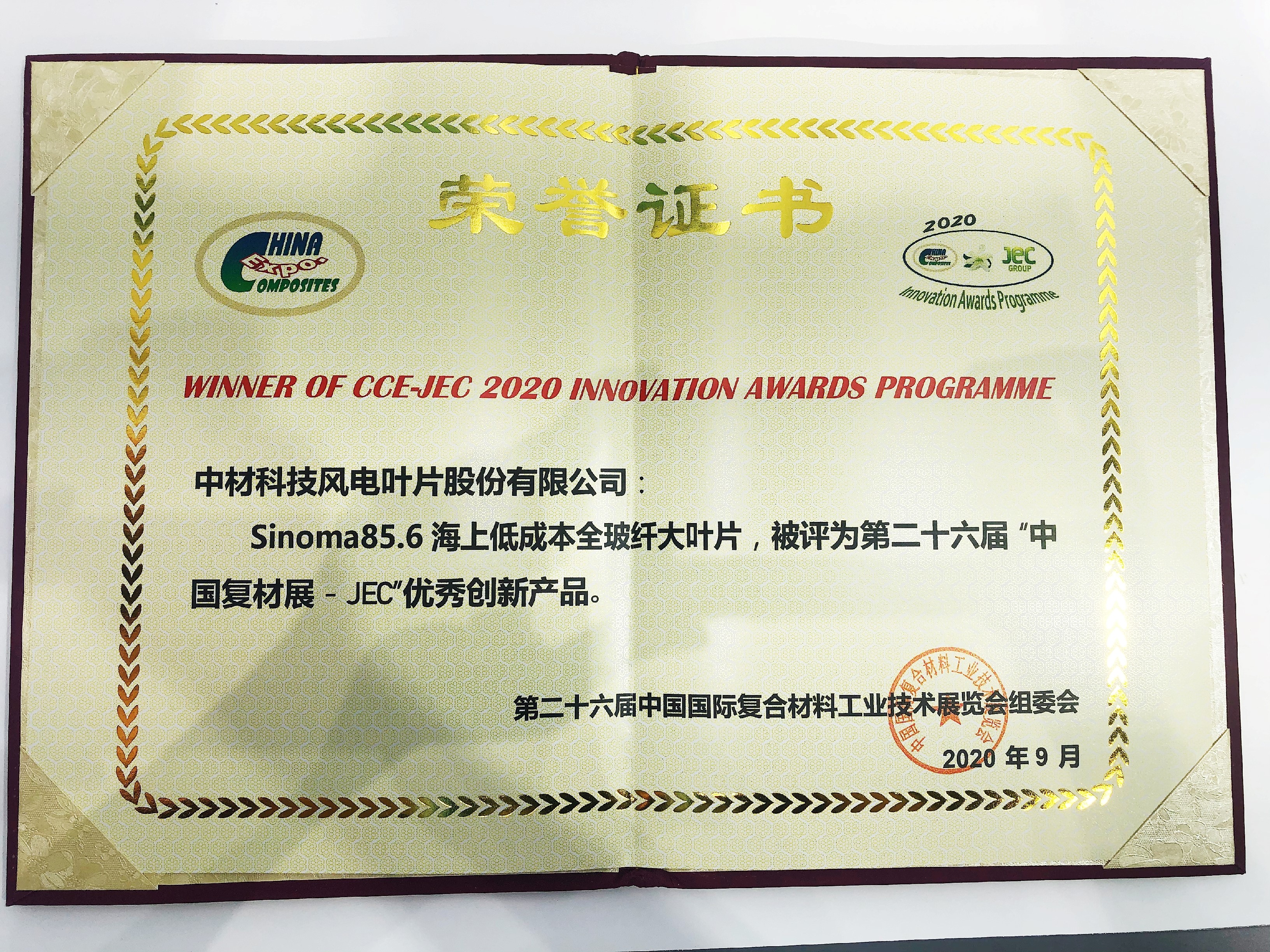 9月2日上午11點,在世博館2號館的新聞發(fā)布區(qū)舉行了隆重的2020 CCE-JEC創(chuàng)新產(chǎn)品頒獎儀式,來自國內(nèi)外34家企業(yè)的44件創(chuàng)新產(chǎn)品角逐原材料、應(yīng)用、工藝技術(shù)及設(shè)備三大類9項大獎。中材科技風(fēng)電葉片股份有限公司的參展產(chǎn)品“Sinoma85.6海上低成本全玻纖大葉片”被評為第二十六屆“中國復(fù)材展-JEC”優(yōu)秀創(chuàng)新產(chǎn)品獎。公司董事長薛忠民參加了頒獎儀式。