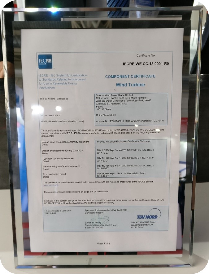 10月18日上午,公司展臺人頭攢頭,共同見證“全球首張IECRE部件證書頒發(fā)儀式”,由國際知名認證機構(gòu)德國TÜV NORD向公司頒發(fā)Sinoma59.5D葉片IECRE部件認證證書,這也是國際權(quán)威認證體系IECRE頒發(fā)的全球首張葉片部件認證證書。